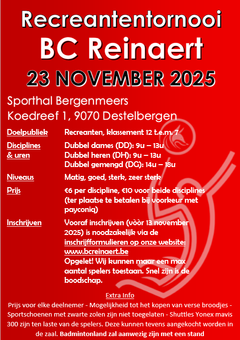 Je hebt gemakkelijke (sportieve) kledij nodig en sportschoenen, Heb je een racket, breng het zeker mee, wij zorgen voor de pluimpjes.